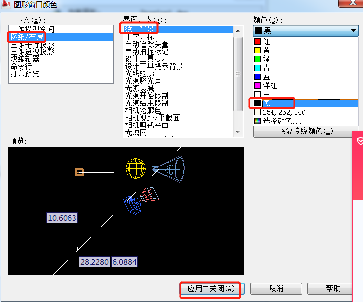 3.接下来点击-图纸/布局-统一背景-再选择我们需要的黑色背景应用并关闭即可