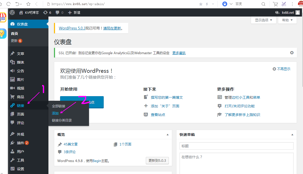 第一步如图1:先登录wordpress后台点击→链接→添加